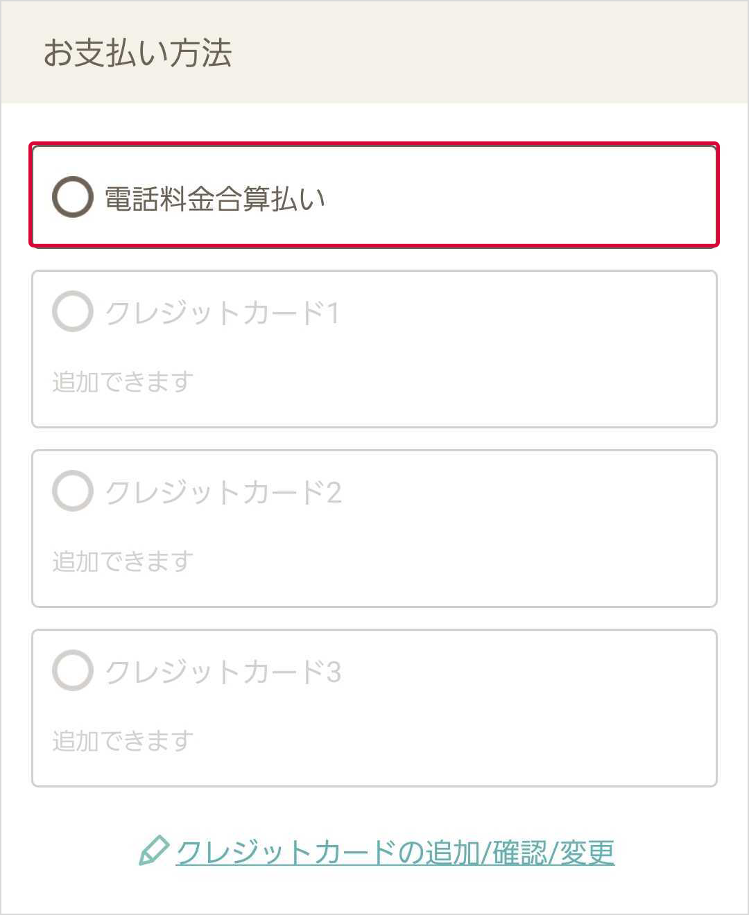 (1)お支払い方法欄にて「クレジットの追加/確認/変更」を選択