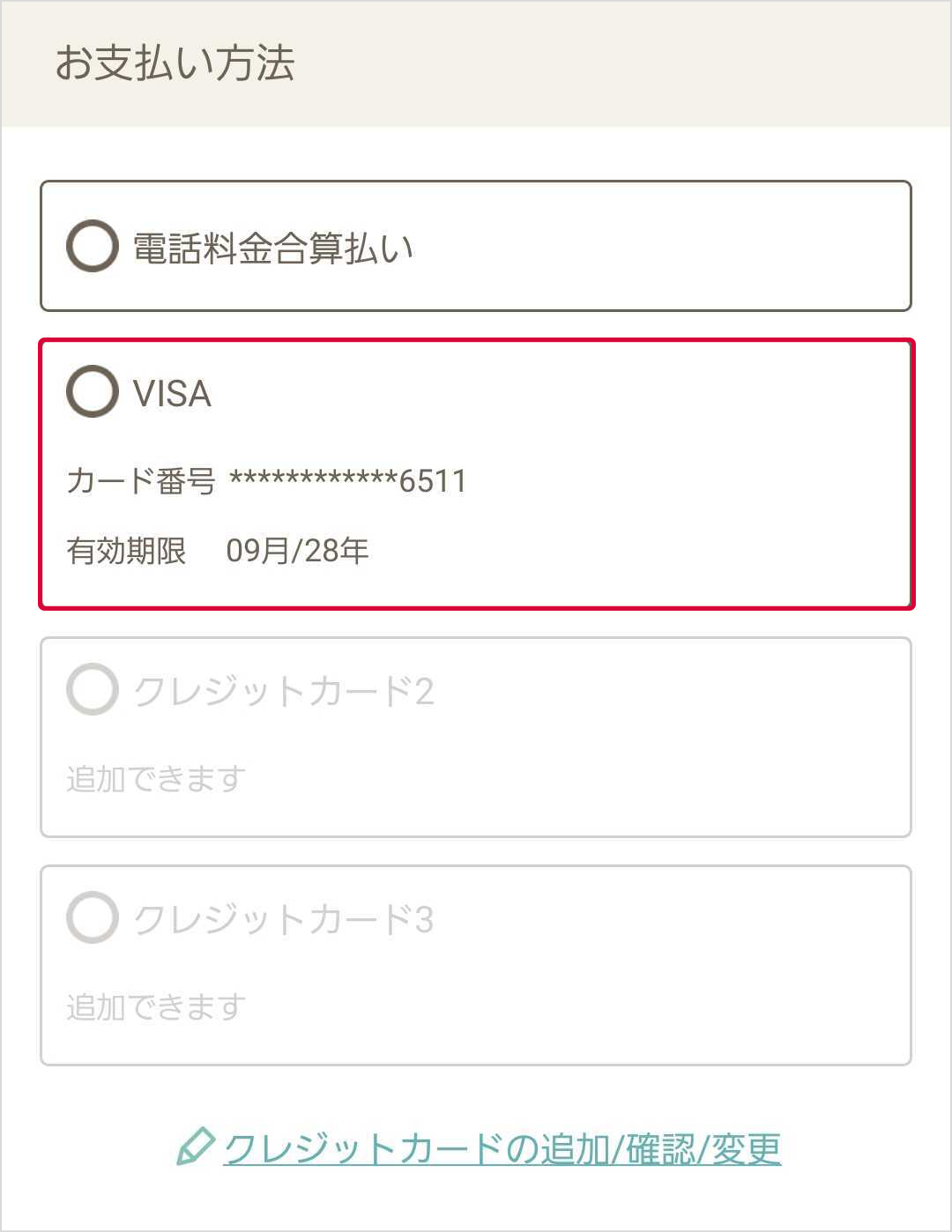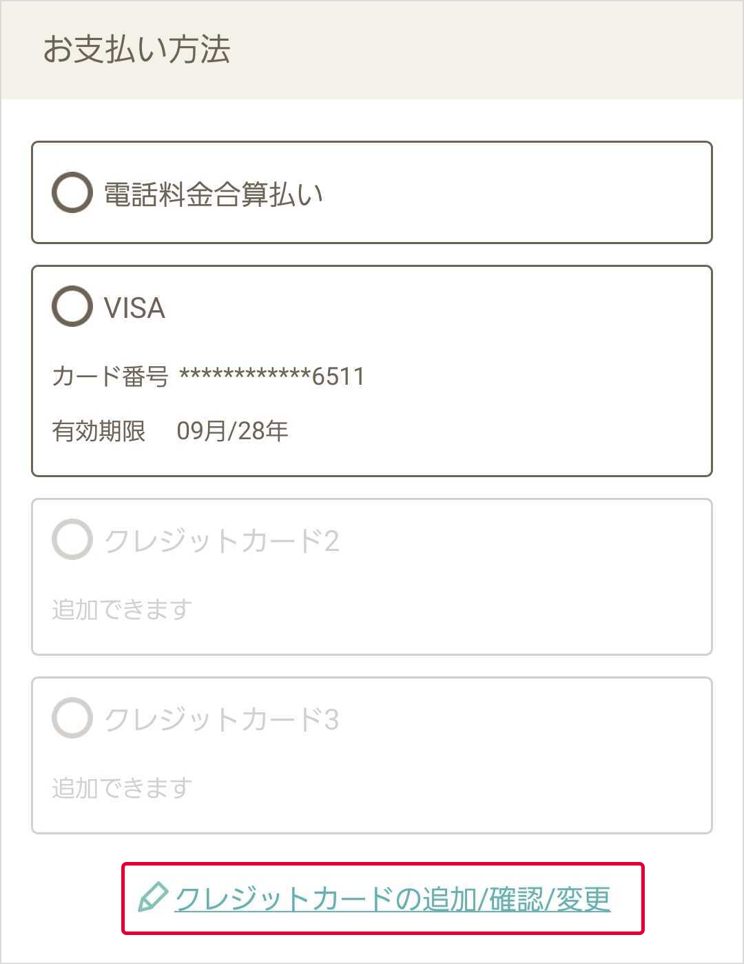- お支払いに使用するクレジットカードが選択肢にない場合、登録が必要です。