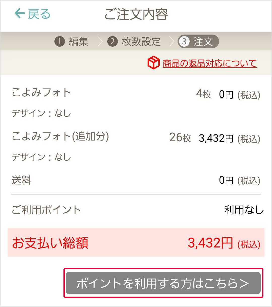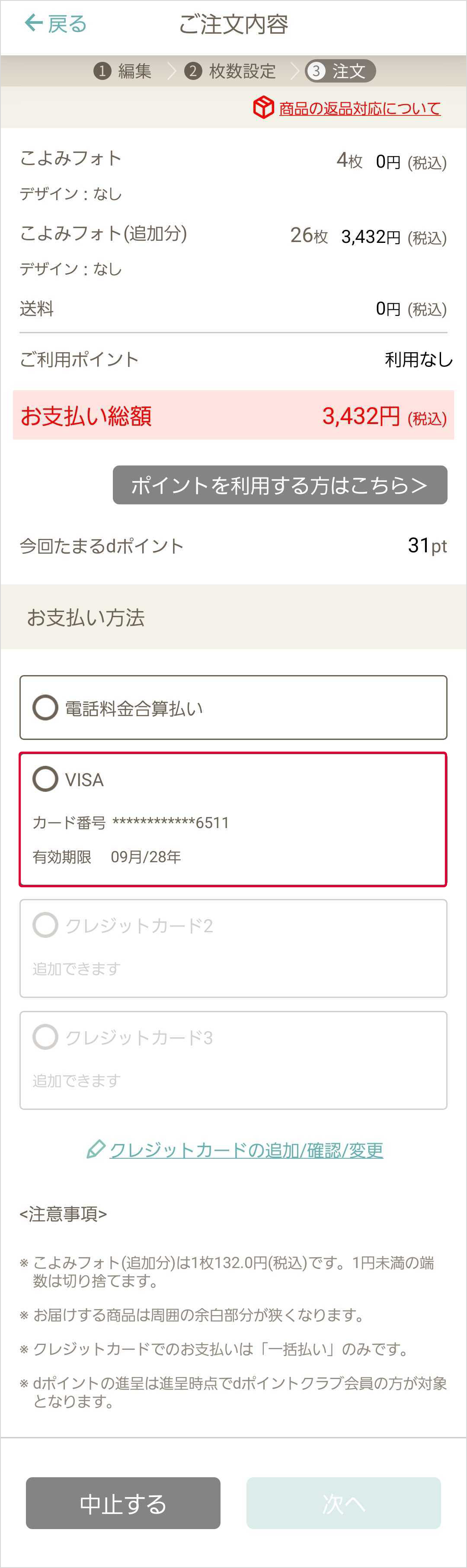 無料プリント権利分を超えて注文する場合の支払い方法はご注文内容確認画面にて「電話料金合算払い」、または「クレジットカード」払いへ変更可能です。