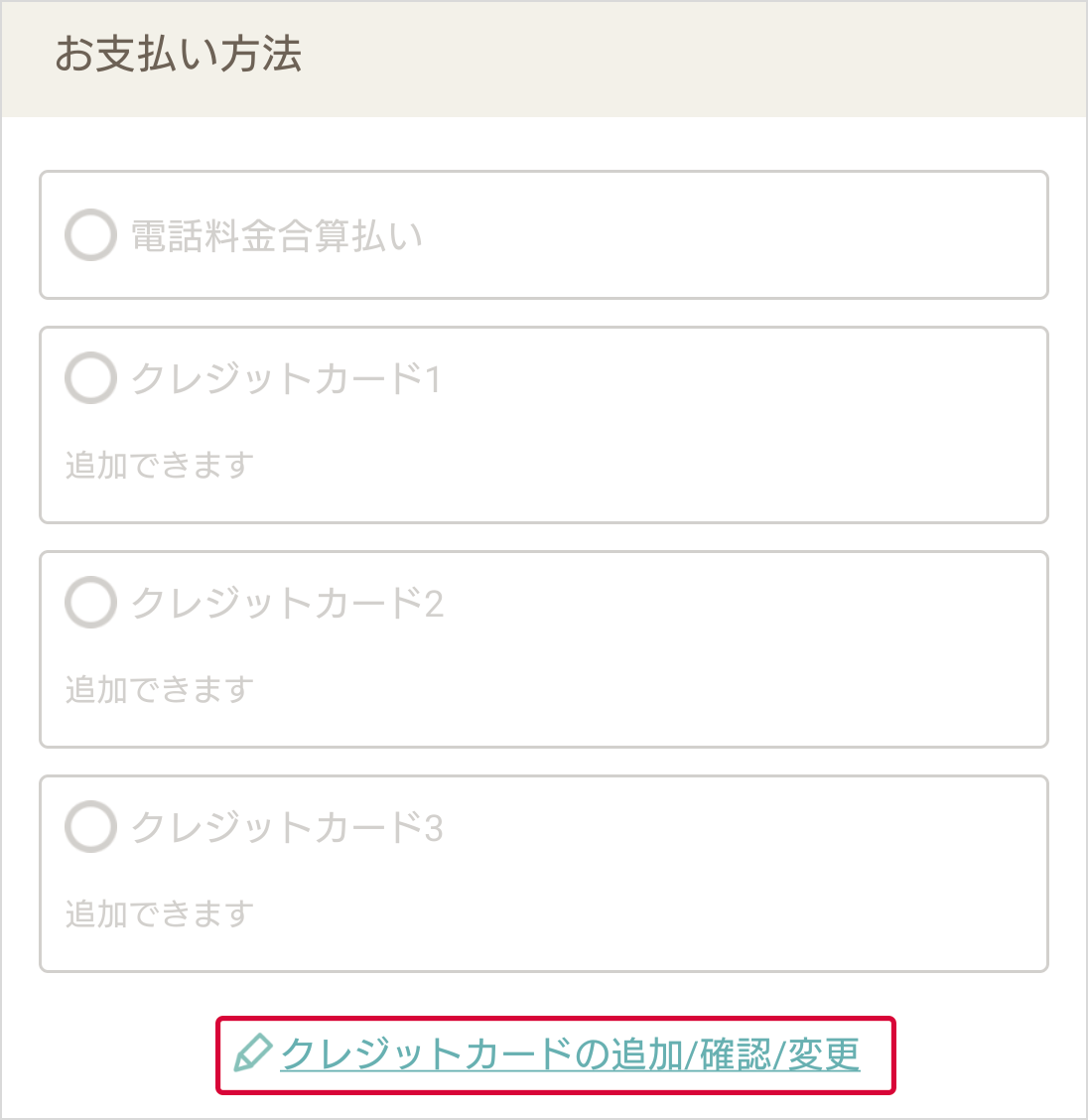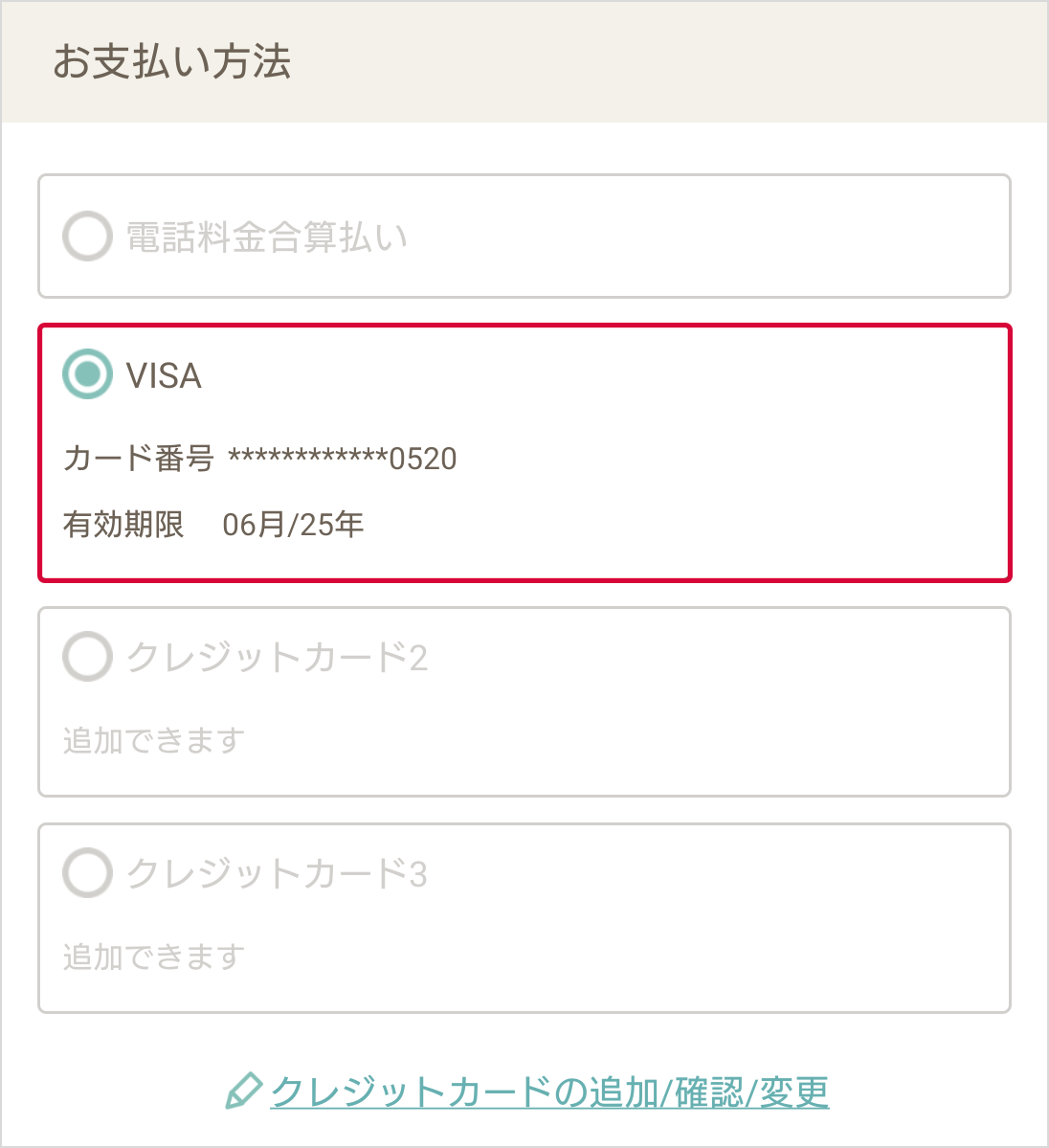 - お支払いに使用するクレジットカードが選択肢にない場合、登録が必要です。