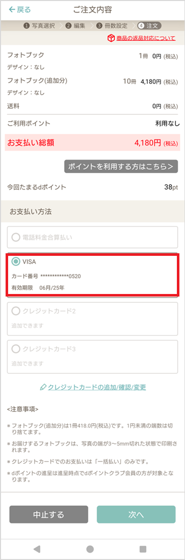 無料プリント権利分を超えて注文する場合の支払い方法は、ご注文内容確認画面にて月額使用料でご利用の「クレジットカード」以外に、他のクレジットカードに支払い方法を変更が可能です。